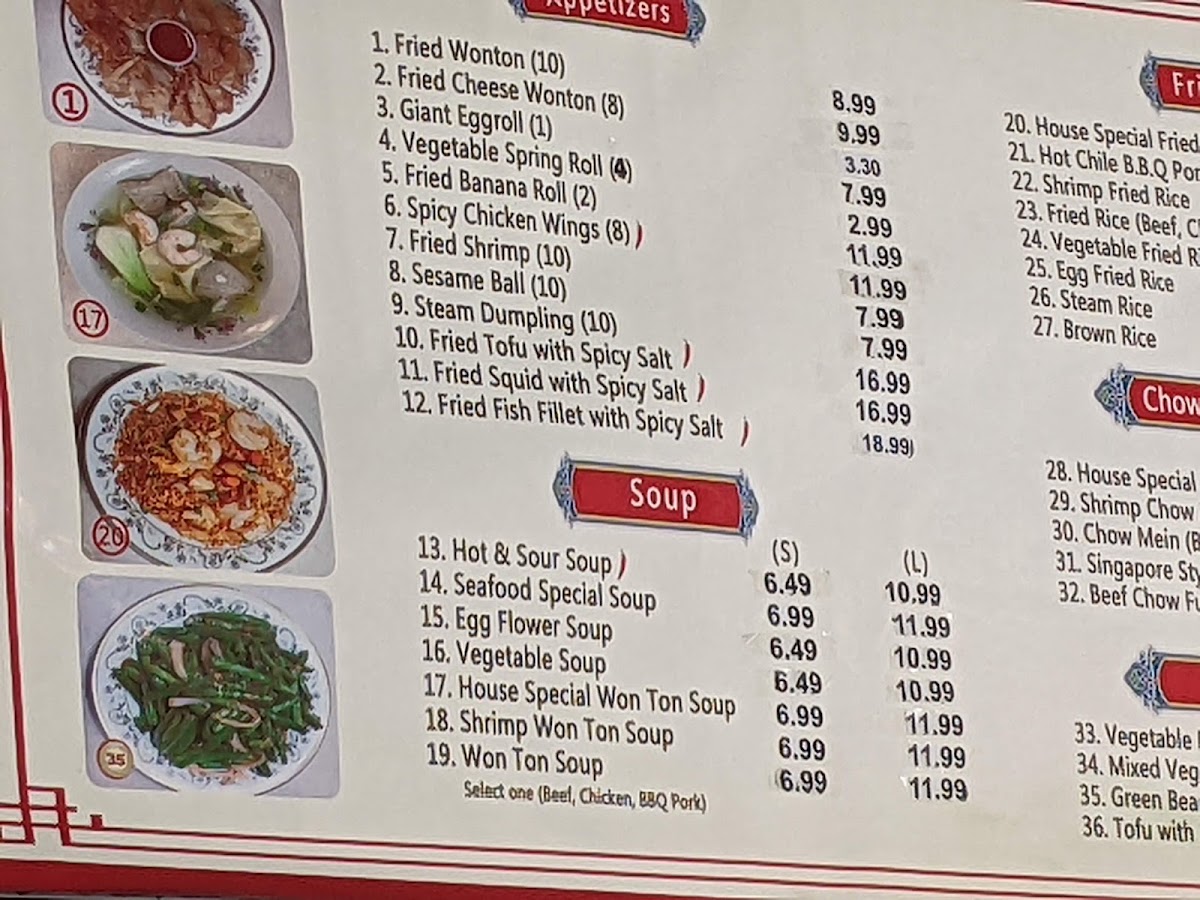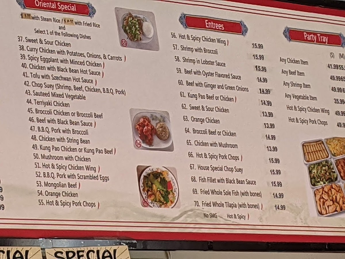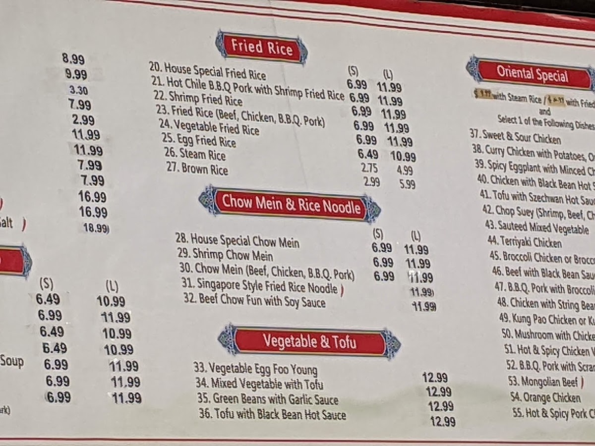 The menu at Oriental House offers a delightful mix of flavorful dishes that cater to a variety of tastes. For appetizers, guests can enjoy the crispy Fried Banana Roll (2 Pcs), the savory Fried Fish Fillet With Spicy Salt, or the tasty Chicken Steam Dumpling (10 Pcs). Their fried rice selection includes Hot Chile BBQ Pork With Shrimp Fried Rice and the flavorful House Special Fried Rice. Vegetarians can opt for dishes like Mixed Vegetables With Tofu or the Spicy Tofu With Minced Chicken. The soup options range from the tangy Hot And Sour Soup to the comforting House Special Won Ton Soup. In the Oriental Special section, the Hot & Spicy Pork Chops and Orange Chicken stand out as flavorful, must-try choices. The Chow Mein & Rice Noodles selection offers favorites like the Beef Chow Fun and Shrimp Chow Mein. For entrees, you can savor options like Kung Pao Beef Or Chicken or the delicious Shrimp In Lobster Sauce. With a wide variety of dishes available, the menu at Oriental House promises a satisfying dining experience for all.